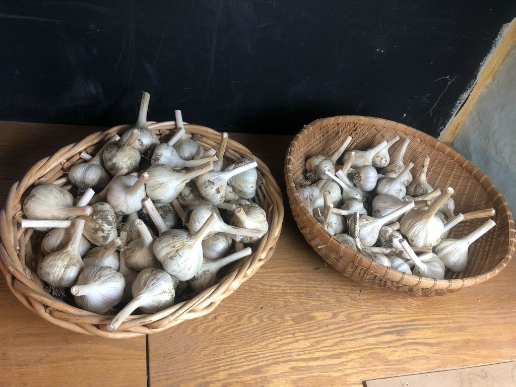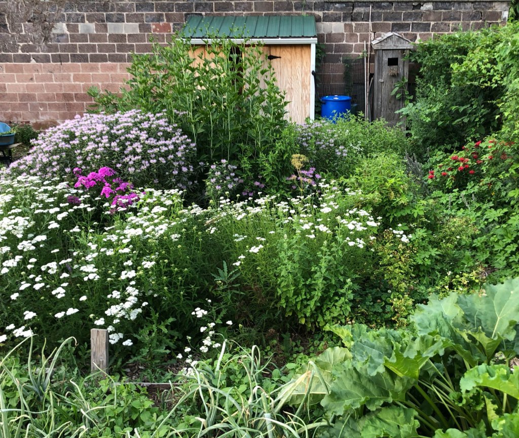 Currently we have 35 garden plots, 15 of which are used for donation crops. There is an area where we collect garden waste and incorporate horse manure and straw to make hot compost that eventually goes back to the beds. The shed downspout runs into two rain barrels which we use for watering beds. A large perennial bed hosts flowers and herbs near the shed and there is an annual cut-flower bed that adds explosive color to the hillside.